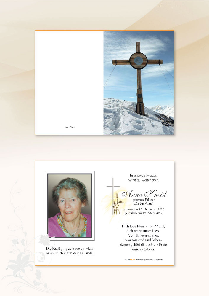 Bestattung wurde durchgeführt von: Daniel Klocker Bestattung Klocker GmbH Oberlängenfeld 41 6444 - Längenfeld Tel.: 05253 5561 zum Bestatter