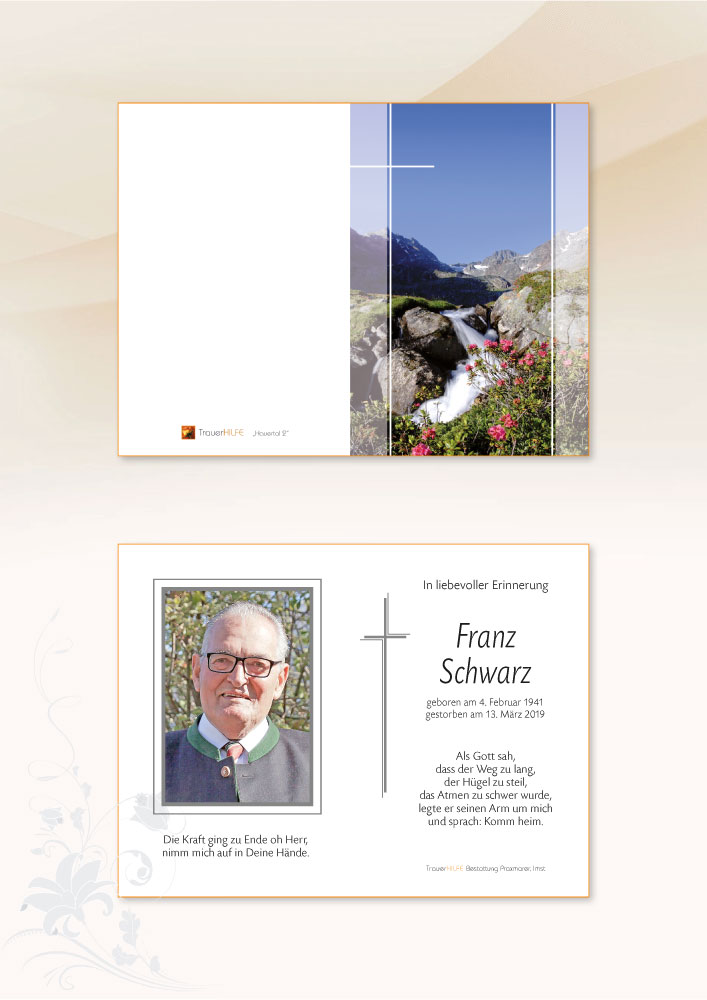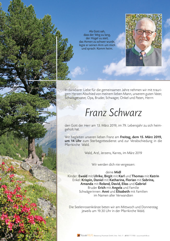 und sprach: Komm heim. Liebe Midl, Birgit, lieber Ewald und Thomas mit Katrin und Familien, es ist immer zu früh, wenn ein liebenswerter Partner, Vater, Schwiegervater und Opa seine Lieben verlassen muss, aber die schönen Erinnerungen leben weiter. Franz war ein feiner Mann . Wir werden ihn nicht vergessen. Wir wünschen euch viel Kraft und Trost in dieser schweren Zeit. Wir sind in Gedanken bei euch Romana und Lois mit Familie14.03.2019 05:55 - Fam . Neurauter Romana und Lois