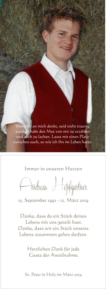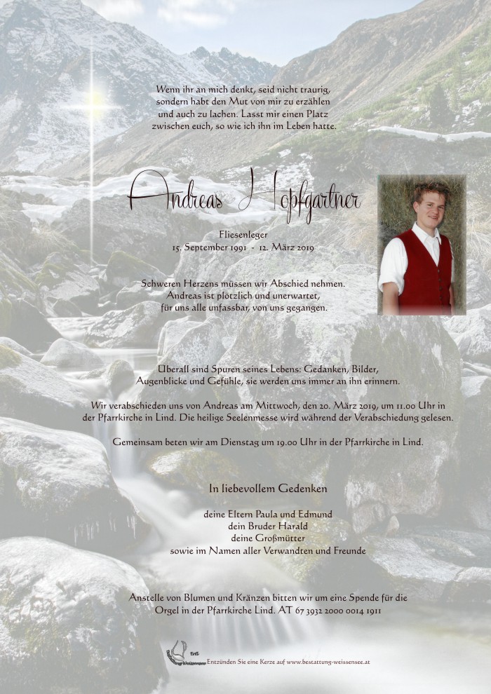 Andreas wird immer an eurer Seite und mitten unter euch sein auch wenn ihr ihn nicht sehen könnt.14.03.2019 20:20 - Eine mitfühlende Mama aus Lienz
