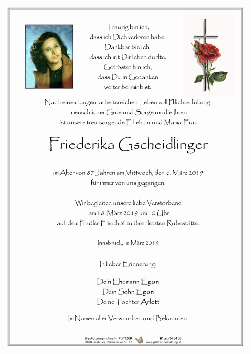 Bestattung wurde durchgeführt von: Mag. Martin Müller Concordia Bestattung 6020 - Innsbruck Reichenauer Str. 95 6060 - Hall i. T. Salzburger Str. 33 Tel.: 0512 34 34 33 Tel.: 05223 57 2 54 zum Bestatter
