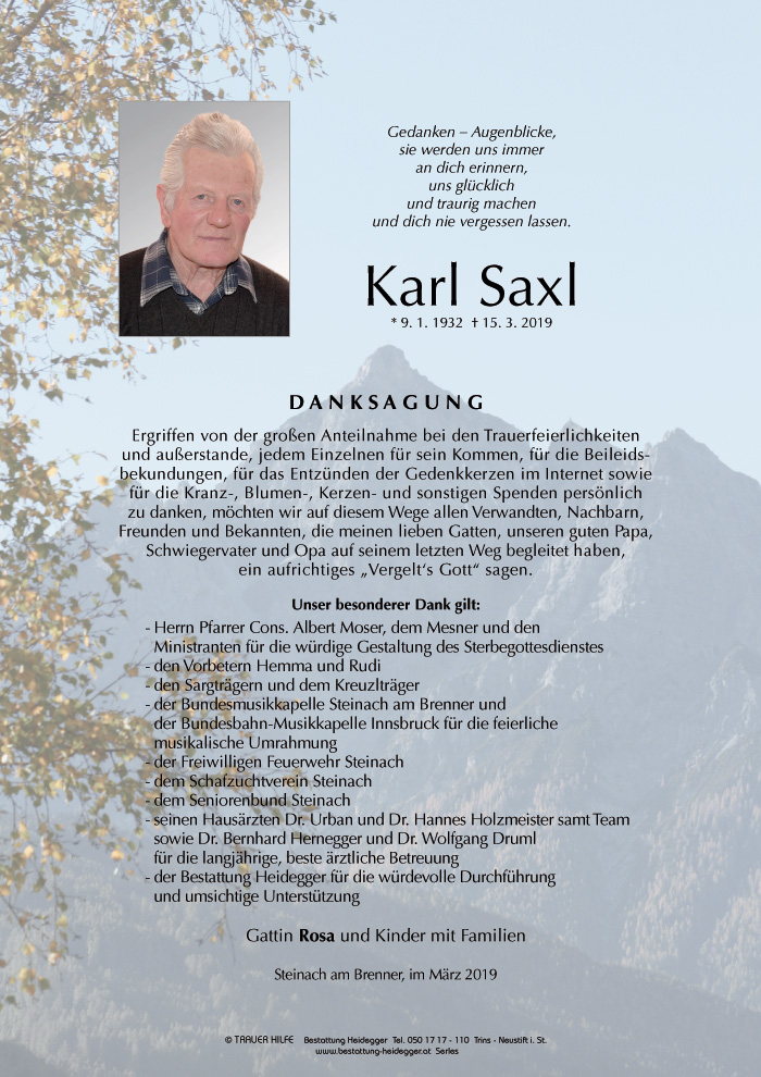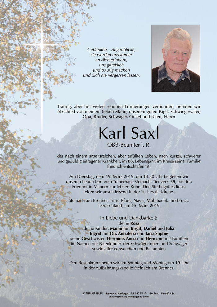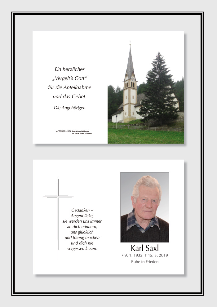 Man kann es no goanit glauben, es isch oanfach schun a Jahr her. Genau vor einem Jahr, also am 15. März, hat des soooo gschnieben aba i wollt no unbedingt an dem Tag zu dir foan, weil irgendwie hab i des Gefühl kap, dass des der letzte Tag sein wird. Wo i dann doch irgendwie auikemmen bin und di gsegn hab, hat sich mein Gefühl bestätigt, mir isch so vorkommen, obwohl man di nimmer so gut verstehen hat kennen, isch mir so vorkommen, dass du mit deiner Gestik symbolisieren wolltesch, dass du zwischen Leben und Tod stehsch und schon den Herrn gsegn hasch. I hab des nit wahr haben wollen und deswegen hab i zwischendurch ,,Ablenkung“ gebraucht und bin deswegen außi gangen, um Schnee zu schöpfen. Als i dann wieder zu dir in die Stube gangen bin, wollt i da zeigen und sagen, dass es heute volle schneibt und wie kalte Hände i iatz nach dem Schöpfen hab. Als i mei Hand in deine glegt hab, hab i genau gemerkt, dass du alles genau mitbekommen hasch sowie gespürt hast, obwohl du es nimmer ausdrücken konntesch. An dem Tag bin i dann wieder hoamgfoan und hab irgendwie immer des Gefühl kap, dass i no an Anruf von da Mama griag (sie isch ja oben geblieben bei da Oma, um zu helfen, da du schon da sehr unruhig woasch), dass du entschlafen bisch, doch dann bin i doch irgendwie eingeschlafen. Aba dann hat Papas Handy geklingelt, i bin sofort aufgewachen und bevor da Papa die Nachricht verkünden hat können, hab i es schon gwisst, was passiert isch. Ab dem Moment hab i es oanfach nit realisieren können, dass du, mein Opa, nimmer mit uns des Leben verbringen kannst. Mein nächster Schritt woa jedoch, des woa von Anfang an klar, wenn de Situation eintritt, dass i mi no von dir verabschieden will und deswegen bin i a no an dem Abend auigfoan, um di zu sehen. Lieber Opa i kanns oanfach immer no nit glauben, dass du nimmer da bisch, i moan immer, wenn i zu enk bzw. zua Oma auifoa, moan i immer, dass du in der Küche auf deinem Platz hinter dem Tisch sitzsch. Doch des isch halt nimmer und wird a nimmer sein. Aba was i kann isch, dass i all die Erinnerungen, die i mit dir und mit da Oma erleben hab dürfen, in mir tragen darf, was a nit selbstverständlich isch. Was i besonders erwähnen will isch, dass i mit dir so a tolle Kindheit erleben hab derfen, i hab mit dir Schlepper foan und Moped foan dürfen usw. Was i a immer so toll gefunden hab isch, mit dir zammen zu den Schafen zu gehen bzw. a zu den Ziegen. De Zeit woa echt einfach super und echt wertvoll. Vor allem a, wenn die Jana und i bei enk oben geschlafen sind und mit enk zammen gespielt haben oder wo du uns Geschichten von dir von früher erzählt hasch, woa sooo toll und a lustig, obwohl du nit in a so tollen Zeit auf die Welt kemmen bisch. Doch langsam kimm i zu an Ende, obwohl des fast goanit geht, da i no so viel schreiben könnt aba irgendwie muss i ja zu an Schluss kemmen und zwar: Opa i hab die sooooo lieb und i wea die a immer lieb haben. I wea di a soooo in Erinnerung behalten wie i iatz versucht hab di zu erläutern bzw. zu beschreiben, wie du a toller Opa woasch bzw. immer für mi bleiben weasch. I vermisse di soooo sehr und wea di a immer vermissen. Was i a no sagen will, i bin soo dankbar, dass i immerhin mit dir zammen 17 Jahre erleben hab dürfen, was a nit selbstverständlich Isch.