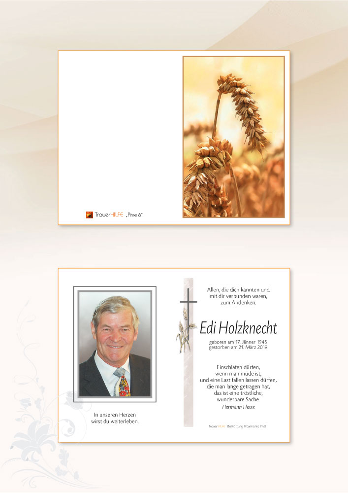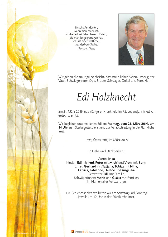 Am Heimgang Deines lieben Mannes, Eures guten Vaters, Schwiegervaters, Opas, Bruders, Schwagers, Onkels und Paten möchten wir Euch allen unser aufrichtiges Beileid aussprechen! Möge Euch der Herrgott viel Kraft schenken in dieser schweren Zeit! Wir werden Edi stets in lieber Erinnerung behalten!