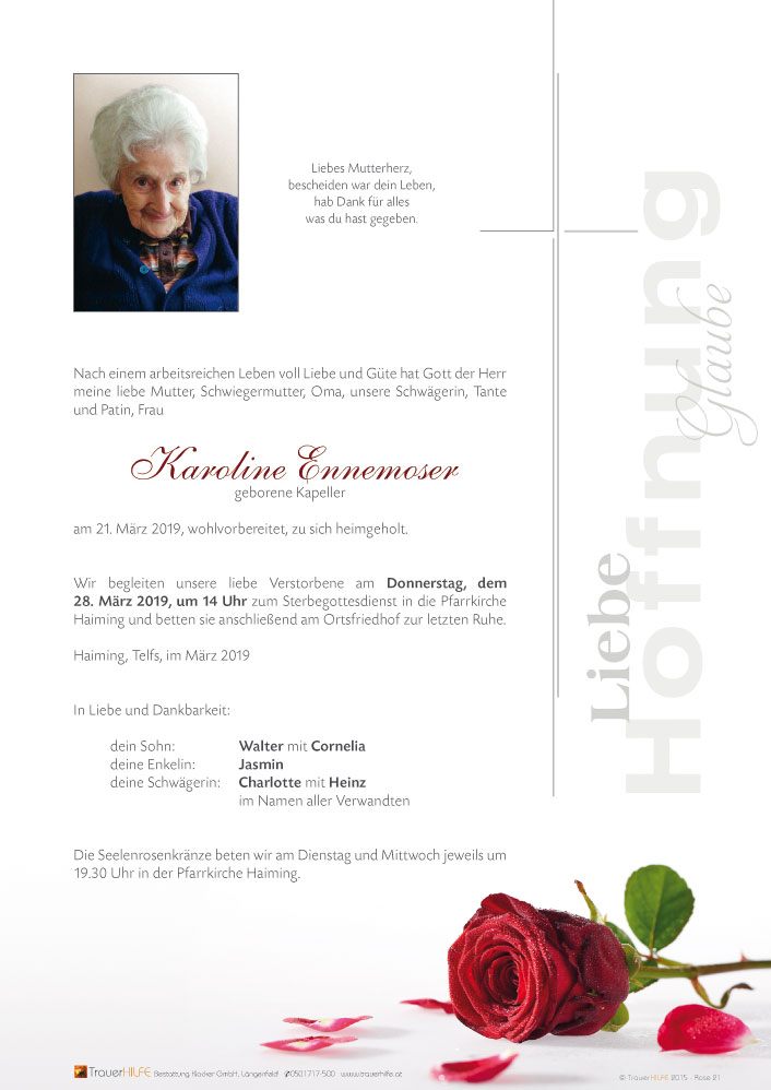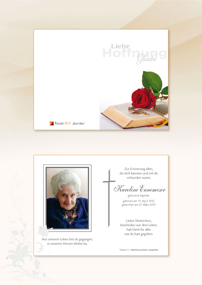 "Ein langer Weg ist nun zu Ende, ein Herz voll Liebe, das nicht mehr schlägt. Und erstmals ruhen deine Hände, die stets für andere sich geregt."