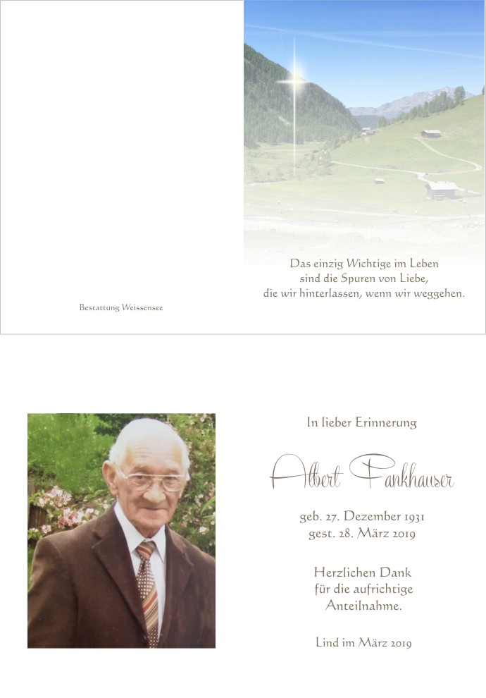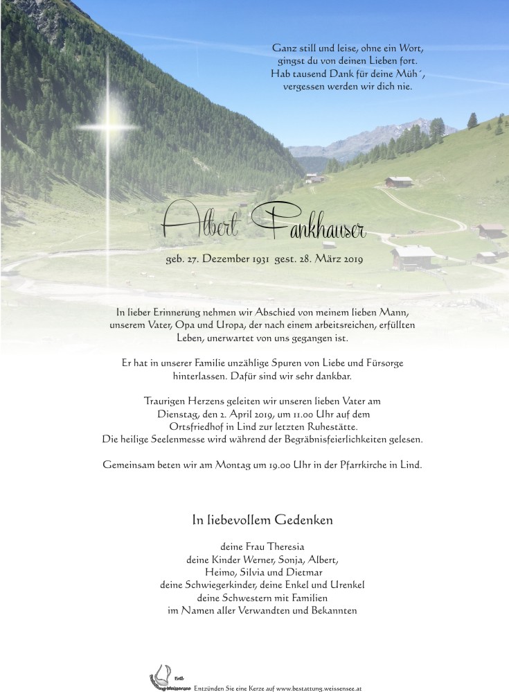 Bestattung wurde durchgeführt von: Markus Ertl Bestattung Weissensee Neusach 26 9762 - Weißensee Tel.: 04713 22 29 zum Bestatter