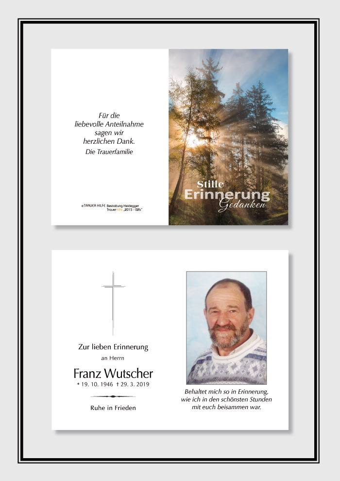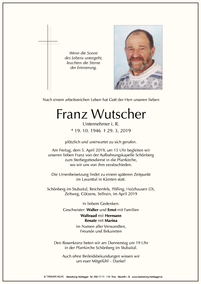 Bestattung wurde durchgeführt von: Karl Neurauter Karl Neurauter Bestattung Heidegger Brennerstraße 69 6150 - Steinach am Brenner Tel.: 05275 5211 zum Bestatter