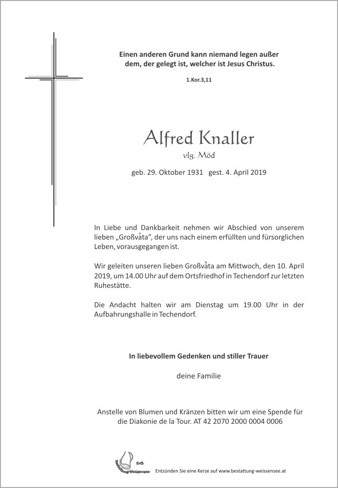 Liebe Frau Knaller Sen., liebe Familie, wir haben gerade auf dieser Seite vom Tod Ihres Mannes, Vaters und Grossvaters erfahren. Vor anderthalb Jahren saß er noch beim Kirchenkaffee bei Zimmermann mit uns zusammen. Wir hoffen, dass Sie im Glauben Trost finden und den erneuten Verlust in Ihrer Familie mit den Versen aus Römer 8, 38 und 39 tragen.