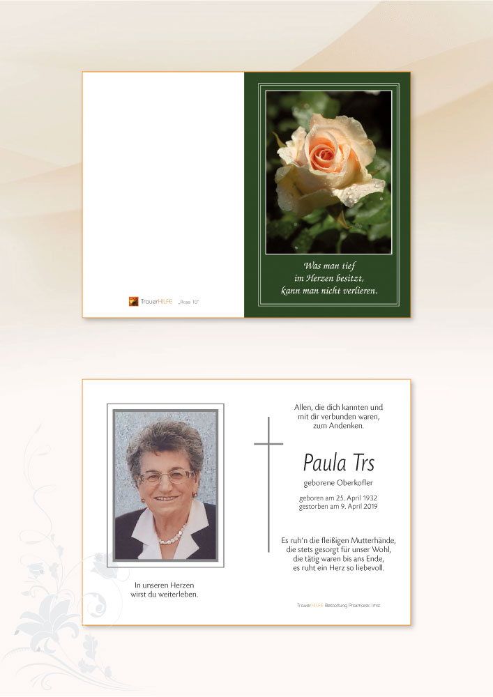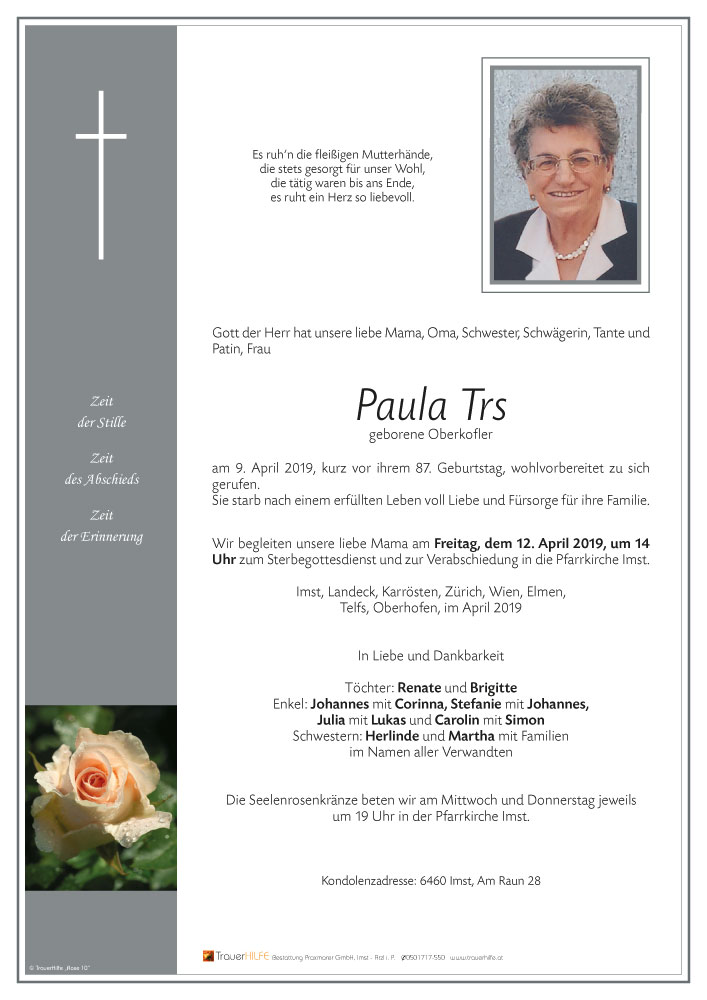 Liebe Renate! Unsere innigste Anteilnahme zum Ableben eurer Mama. Finde Kraft und Trost im Andenken an sie, denn: Begrenzt ist das Leben, doch unendlich die Erinnerung.