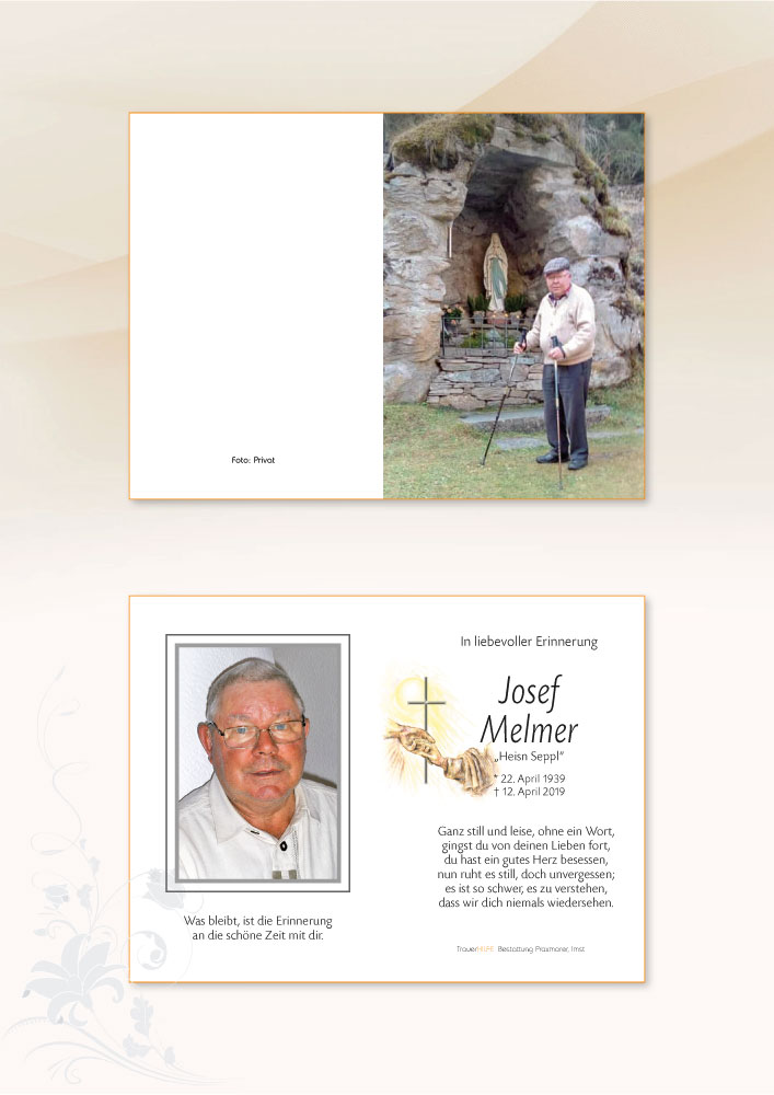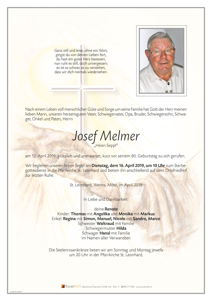 Tief berührt vom plötzlichen Heimgangs eures lieben Josef möchte ich euch mein aufrichtiges Beileid aussprechen. Ich fühle in diesen Stunden mit euch -meine Gedanken sollen euch durch die Zeit der Trauer und des Abschiednehmens begleiten und euch helfen, den Schmerz zu einer liebevollen Erinnerung werden zu lassen.