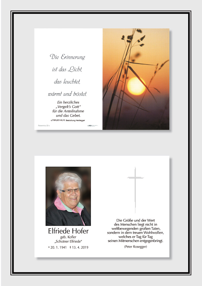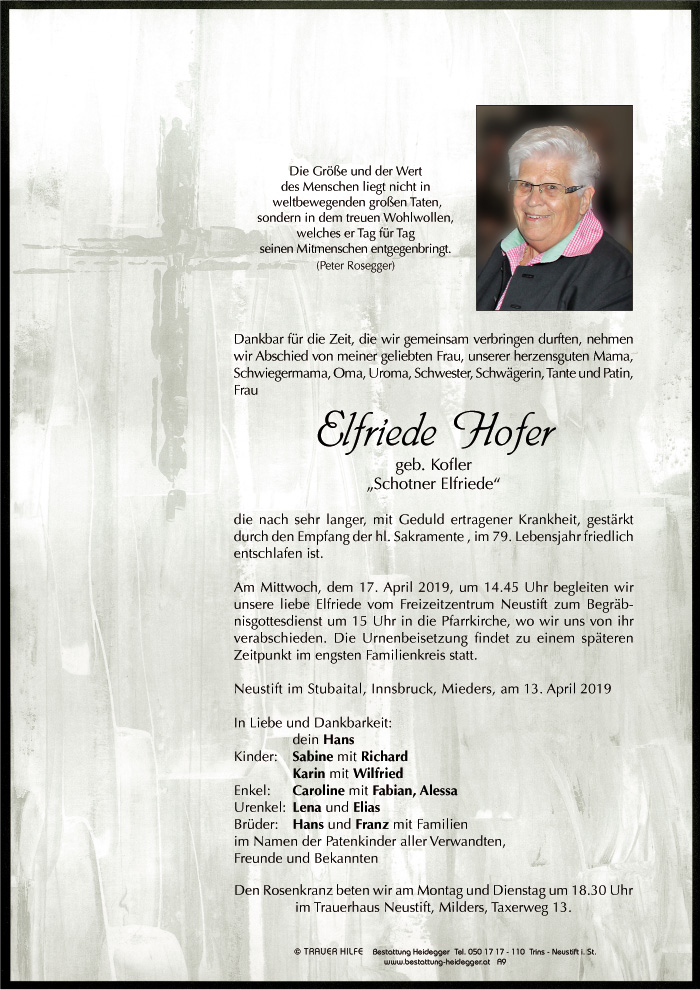 Bestattung wurde durchgeführt von: Karl Neurauter Karl Neurauter Bestattung Heidegger Brennerstraße 69 6150 - Steinach am Brenner Tel.: 05275 5211 zum Bestatter
