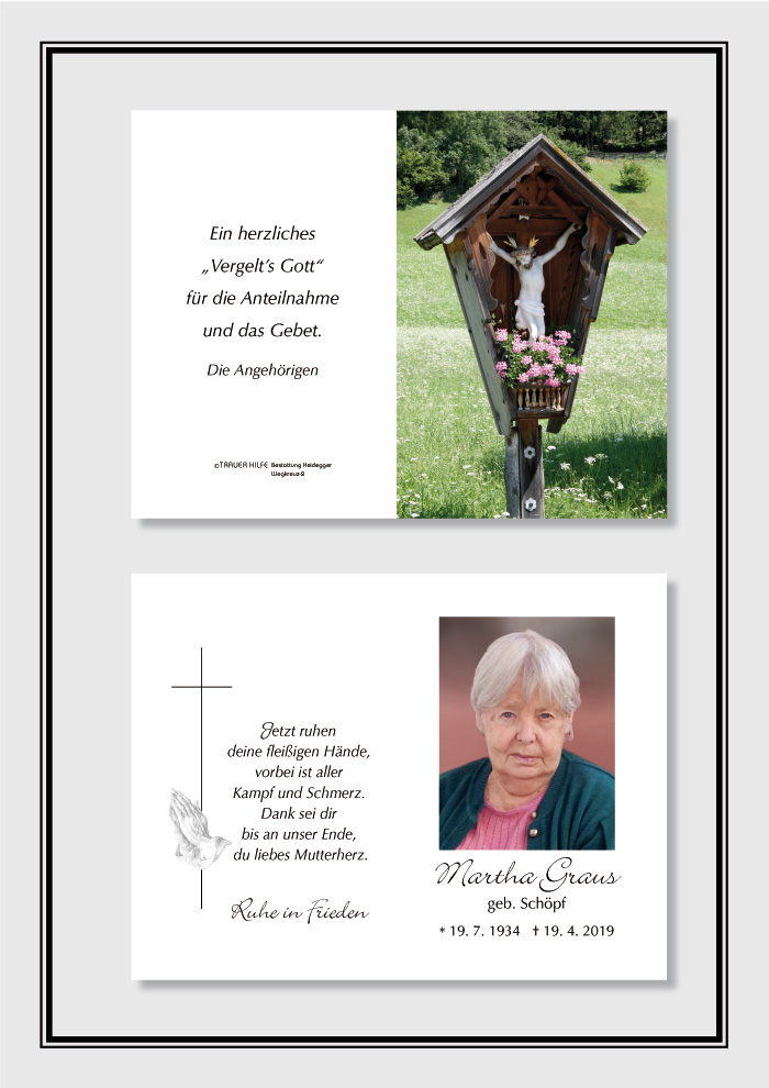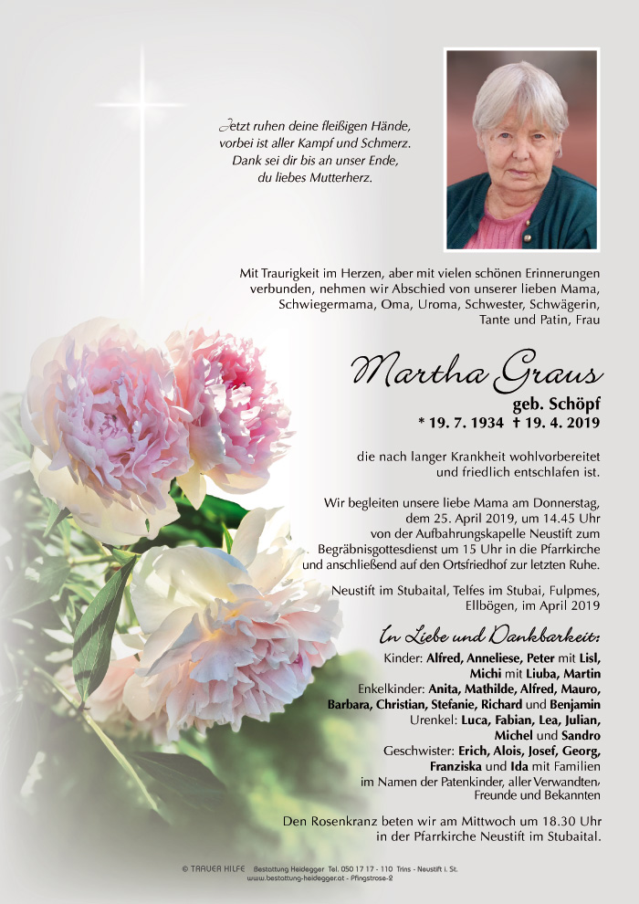 Du hast gesorgt, du hast geschafft, gar manchesmal über deine Kraft. Wir dir nun auch Ruhe gönnen, so sind wir dennoch voller Tränen. Dich leiden sehen und nicht helfen können, war unser größter Schmerz. So ruhe nun wohl, liebes Mutterherz