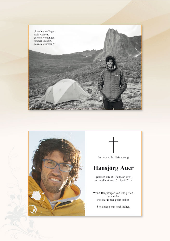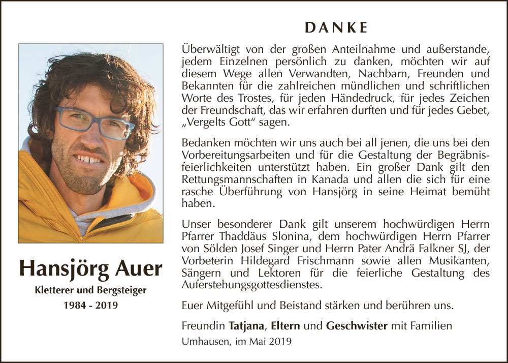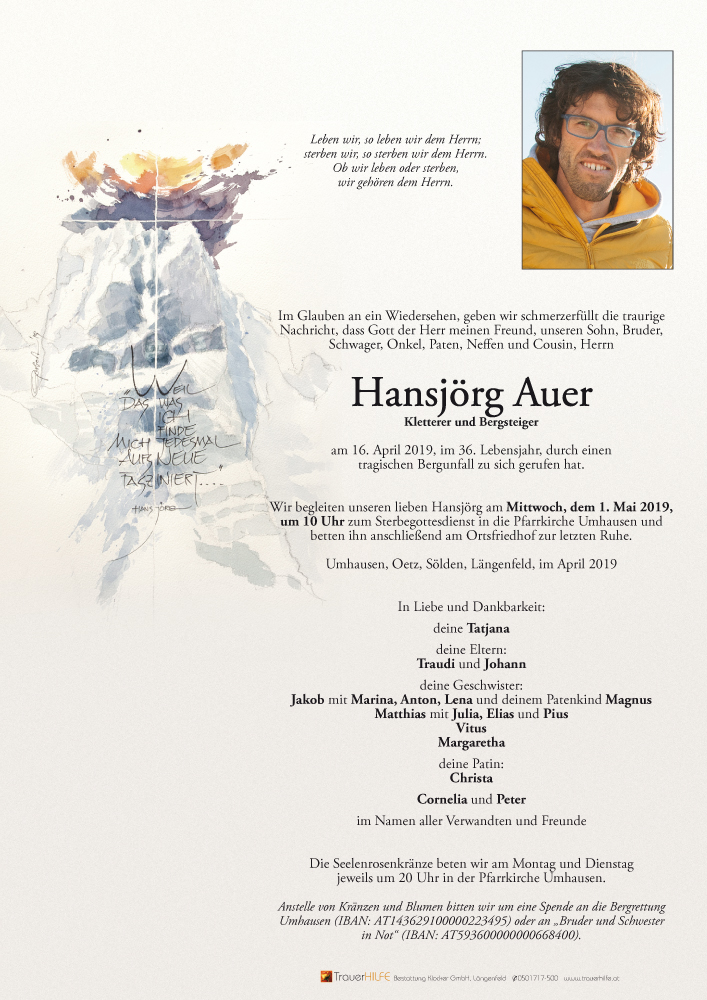 Liebe Trauerfamilie...ich habe heute auf Servus TV die Erinnerungsreportage gesehen, und es erschüttert mich immer noch tief in meinem Herzen , als wäre es gestern gewesen. Unglaublich berührende Worte, Bilder, Gefühle, Beschreibungen......Tränen in den Augen, schwer ums Herz. Es ist einfach immer noch nicht zu glauben....wortwörtlich unfassbar, im Herzen nicht auszuhalten und auch mit dem Verstand einfach nicht begreifbar. Dass Hansjörg und seine Kameraden ihre unglaubliche, einzigartige Leidenschaft für die Berge mit dem Leben bezahlen mussten, das ist gleichermaßen tragisch wie auch schicksalhaft und am Ende aller Tage unwiederbringlich Gottes Wille. Möge Gott euch jeden Tag einen Sonnenstrahl spüren lassen, den euer Hansjörg euch vom Himmel aus schicken will......auch im dunkelsten Schatten der Trauer. In aufrichtiger Anteilnahme, Kathrin.
