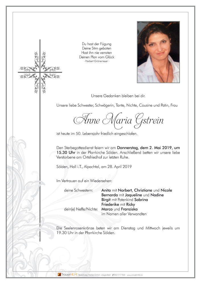 Liebe Anne jetzt bist du da wo du ganz bestimmt nie mehr alleine bist - er fängt Dich auf mit offenen Armen...Gute Reise30.04.2019 08:52 - Mach´s gut....