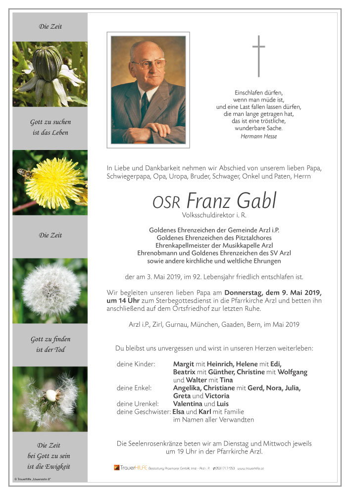 Friedhof Arzl im Pitztal, † 03.05.2019 (91 Jahre)