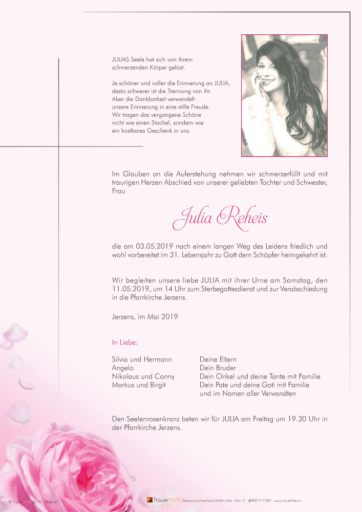 Am allzu frühen Heimgang Eurer lieben Julia möchten wir Euch allen unser aufrichtiges Beileid aussprechen! Möge Euch der Herrgott viel Kraft schenken in dieser schweren Zeit! Wir werden Julia stets in lieber Erinnerung behalten!