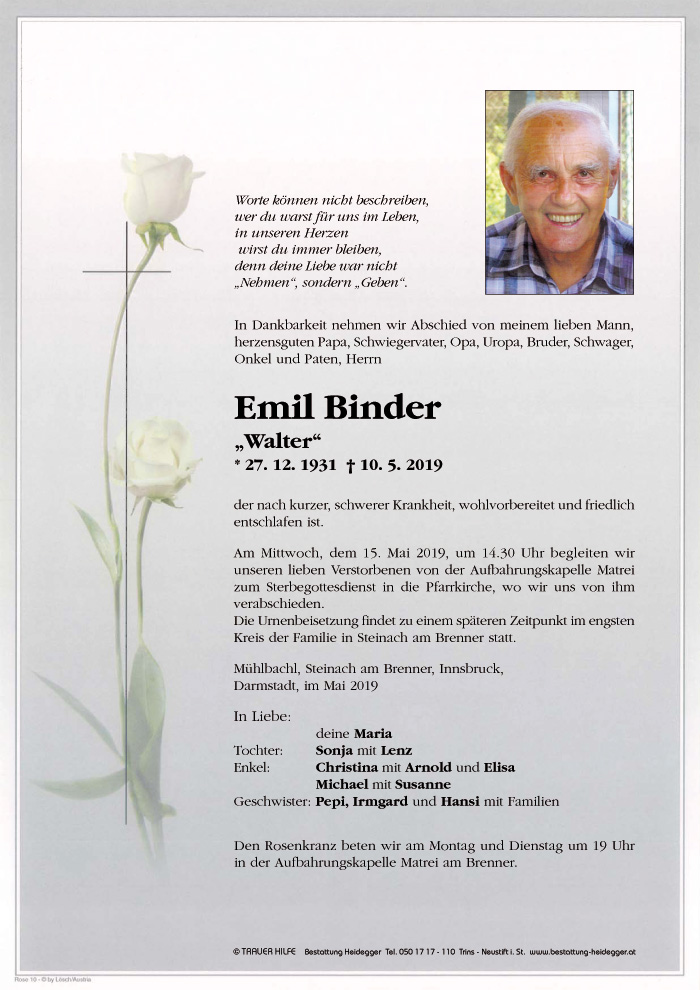 Bestattung wurde durchgeführt von: Karl Neurauter Karl Neurauter Bestattung Heidegger Brennerstraße 69 6150 - Steinach am Brenner Tel.: 05275 5211 zum Bestatter