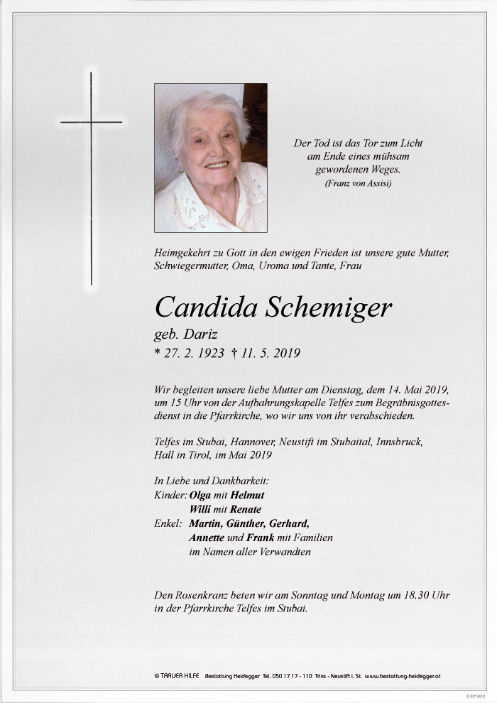 Bestattung wurde durchgeführt von: Karl Neurauter Karl Neurauter Bestattung Heidegger Brennerstraße 69 6150 - Steinach am Brenner Tel.: 05275 5211 zum Bestatter