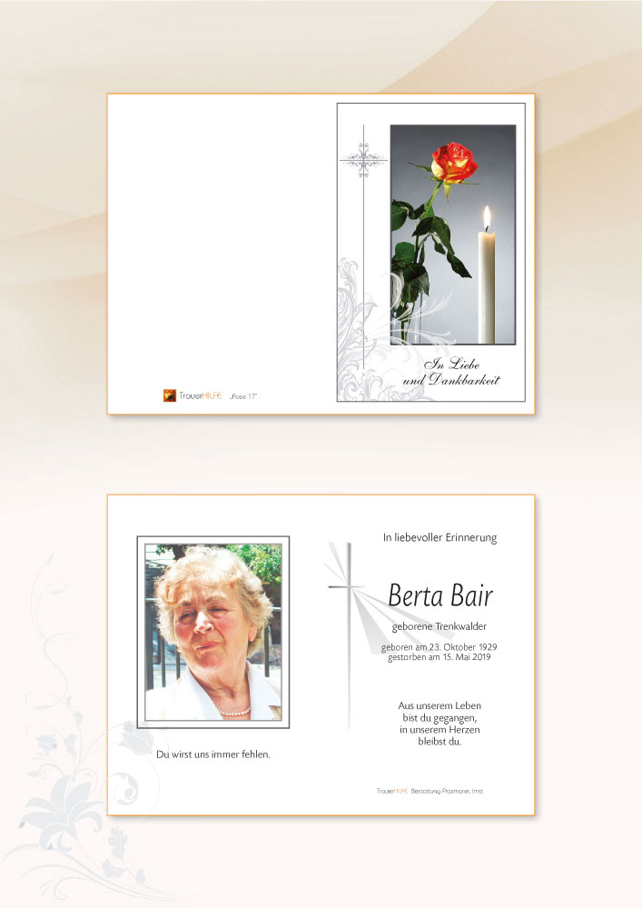 Lieber Hans mit Manuela und Christoph, geschätzte Trauerfamilie. Wir möchten euch in den schweren Stunden des endgültigen Abschiedes von eurer guten Mama und lieben Oma unsere ehrliche Anteilnahme ausdrücken. Ihr großartiges Wirken für ihre Familie wird sie in den ewigen Frieden geleiten.