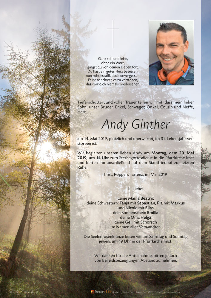 Am allzu frühen Heimgang Eures lieben Andy möchten wir Euch allen unser aufrichtiges Beileid aussprechen! Möge Euch der Herrgott viel Kraft schenken in dieser schweren Zeit!