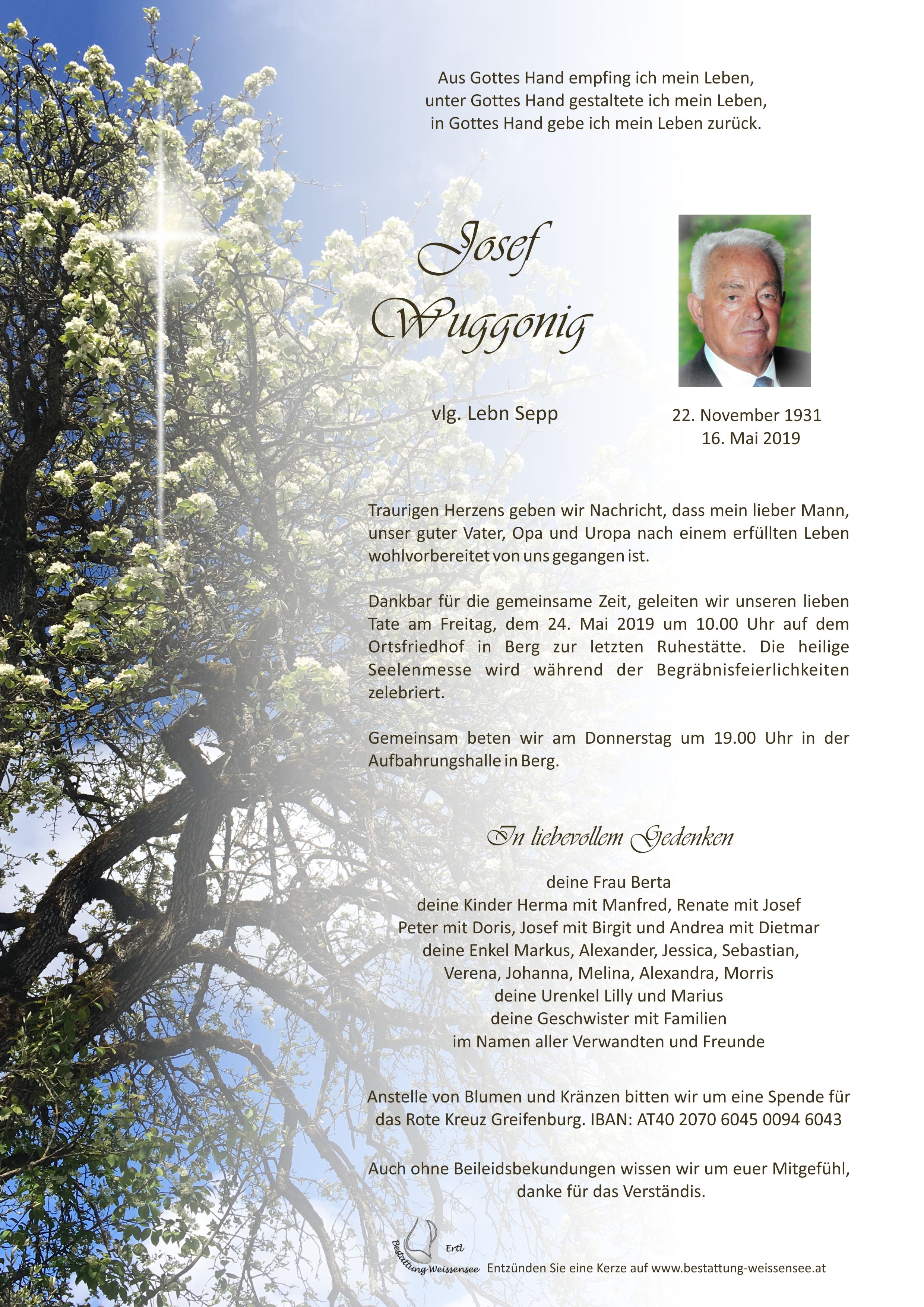 Bestattung wurde durchgeführt von: Markus Ertl Bestattung Weissensee Neusach 26 9762 - Weißensee Tel.: 04713 22 29 zum Bestatter