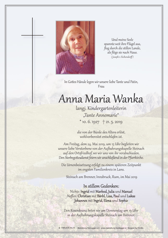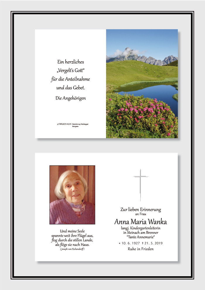 Bestattung wurde durchgeführt von: Karl Neurauter Karl Neurauter Bestattung Heidegger Brennerstraße 69 6150 - Steinach am Brenner Tel.: 05275 5211 zum Bestatter