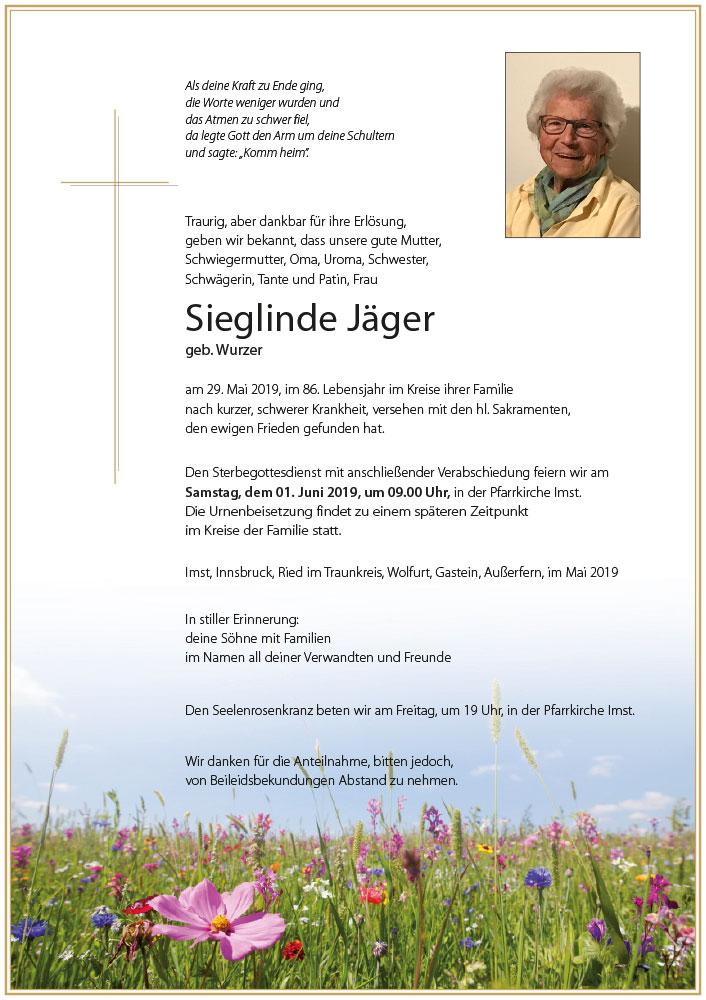 • Und wieder ist ein wertvoller Mensch und ein wirkliches Imster Original von uns gegangen.Sie wird nicht nur Euch , Sie wird Vielen fehlen! Immer werden wir Eure Mutter und Oma in guter Erinnerung behalten.