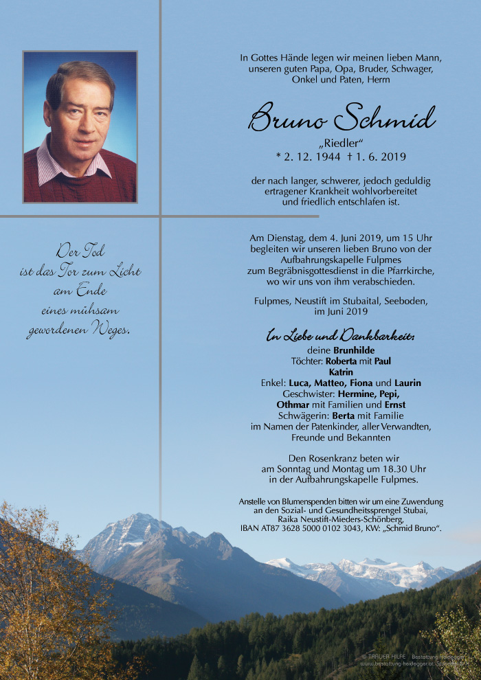 Bestattung wurde durchgeführt von: Karl Neurauter Karl Neurauter Bestattung Heidegger Brennerstraße 69 6150 - Steinach am Brenner Tel.: 05275 5211 zum Bestatter