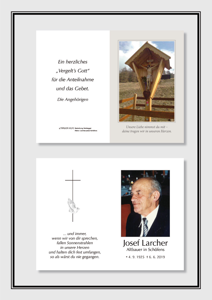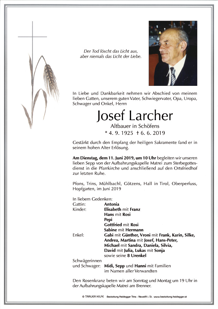 Bestattung wurde durchgeführt von: Karl Neurauter Karl Neurauter Bestattung Heidegger Brennerstraße 69 6150 - Steinach am Brenner Tel.: 05275 5211 zum Bestatter