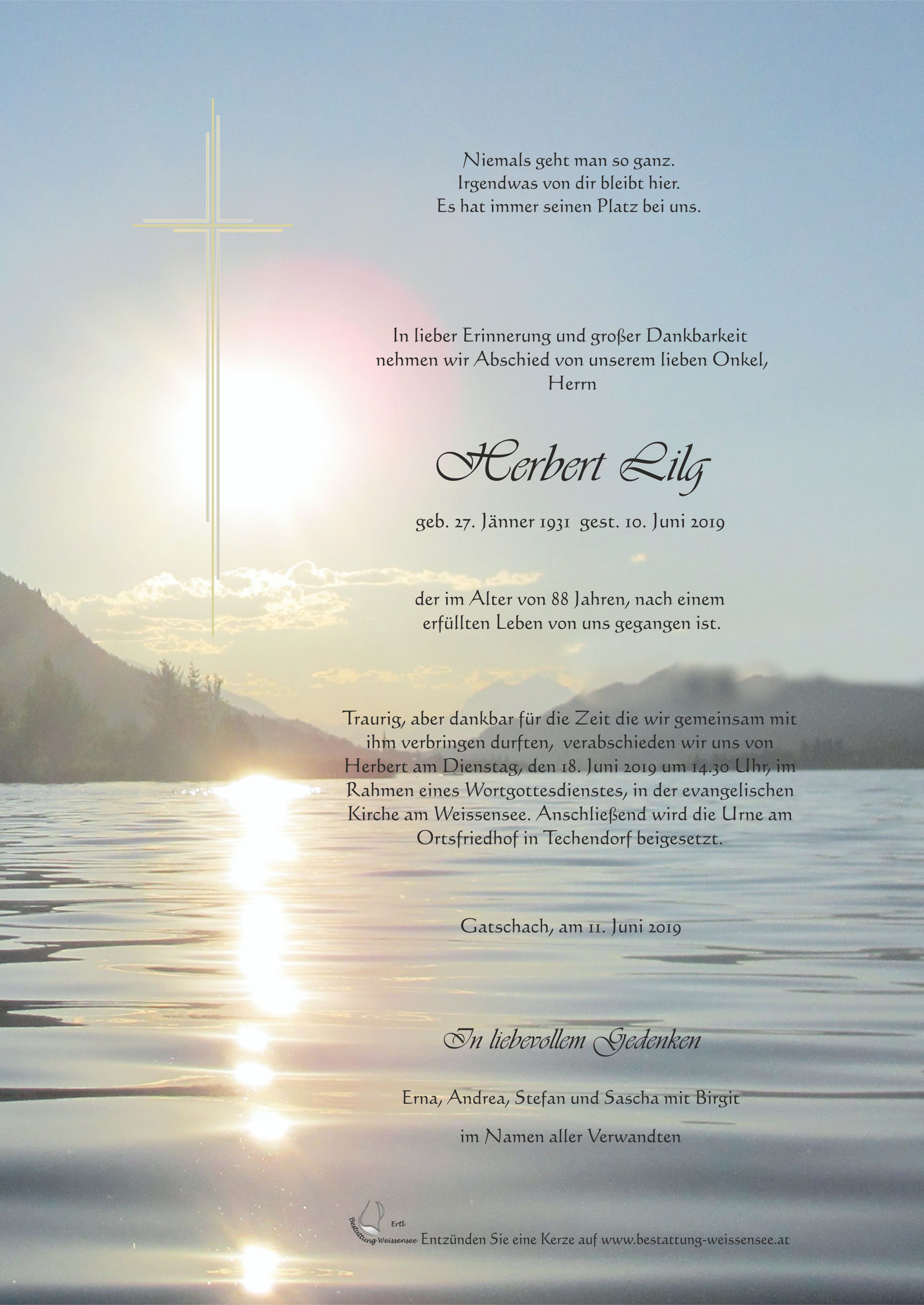 Bestattung wurde durchgeführt von: Markus Ertl Bestattung Weissensee Neusach 26 9762 - Weißensee Tel.: 04713 22 29 zum Bestatter