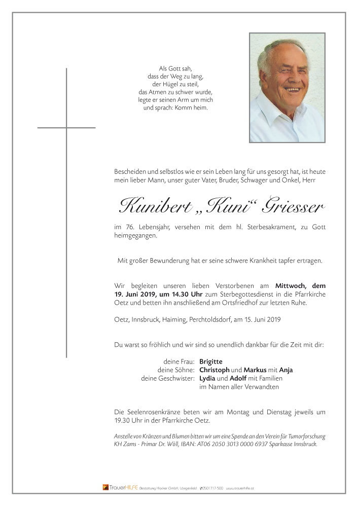 Lieber Kuni, nach deiner Pensionierung habe sehr oft an dich gedacht und mich gefragt wie es dir wohl geht. Leider habe ich dich nie mehr getroffen und muss heute bestürzt von deinem Ableben erfahren. Du warst ein so liebenswürdiger und freundlicher Mensch und alle mochten dich, ob jung oder alt! Ich und viele weitere werden dich sehr vermissen, denn Menschen wie dich braucht diese Welt mehr denn je! Eine gute Reise lieber Kuni und mein herzliches Beileid an die Familie!