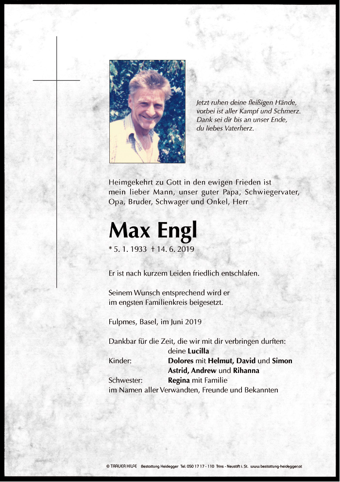 Bestattung wurde durchgeführt von: Karl Neurauter Karl Neurauter Bestattung Heidegger Brennerstraße 69 6150 - Steinach am Brenner Tel.: 05275 5211 zum Bestatter