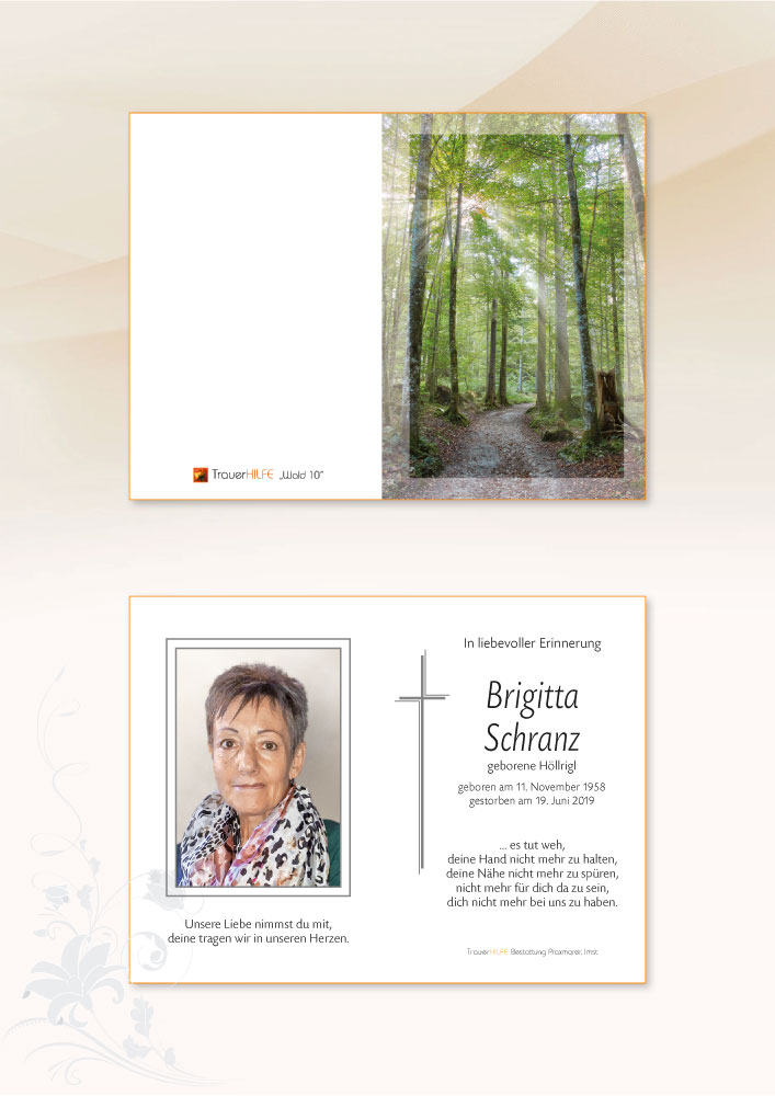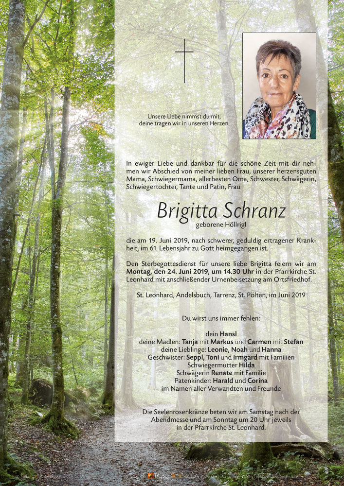 Tief betroffen habe ich heute die traurige Nachricht vom Tod eurer lieben Mama Brigitta erfahren. Eure Mama wird euch jetzt von oben beschützen und in euren Herzen weiterleben.