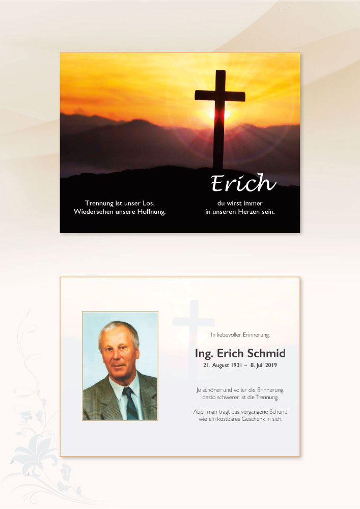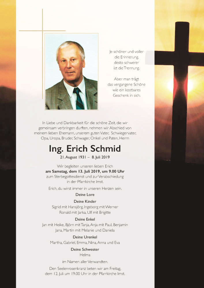 Mit Erich ist für mich ein Stück Kindheits- und Jugenderinnerung gegangen. Für euch ein fürsorglicher Ehemann und Vater. Die vielen schönen und unvergesslichen Stunden, welche ihr mit meinen Eltern verbracht habt werden immer in Erinnerung bleiben. Danke für die jahrelange Freundschaft unserer Familien. Eric und Werner Francan