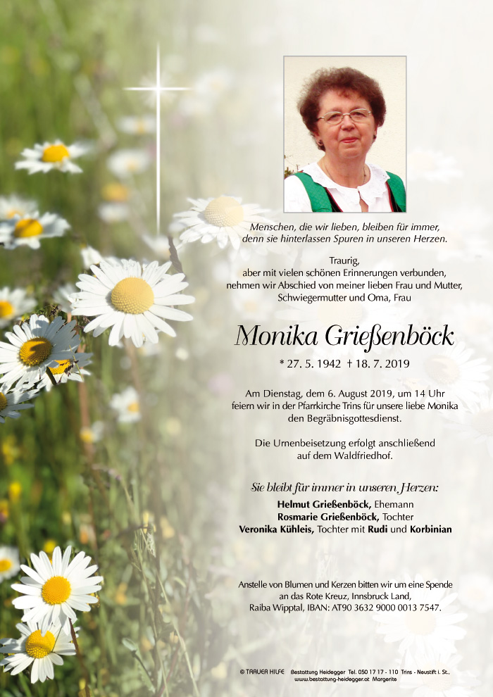 Bestattung wurde durchgeführt von: Karl Neurauter Karl Neurauter Bestattung Heidegger Brennerstraße 69 6150 - Steinach am Brenner Tel.: 05275 5211 zum Bestatter