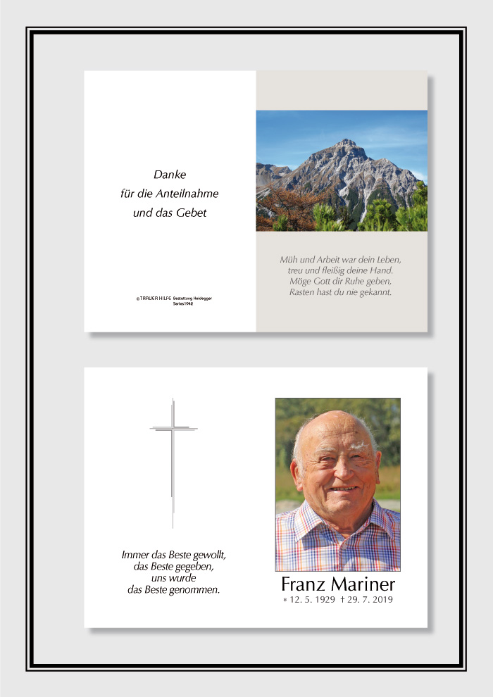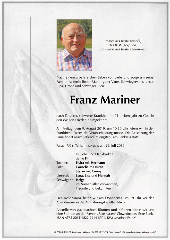 Bestattung wurde durchgeführt von: Karl Neurauter Karl Neurauter Bestattung Heidegger Brennerstraße 69 6150 - Steinach am Brenner Tel.: 05275 5211 zum Bestatter