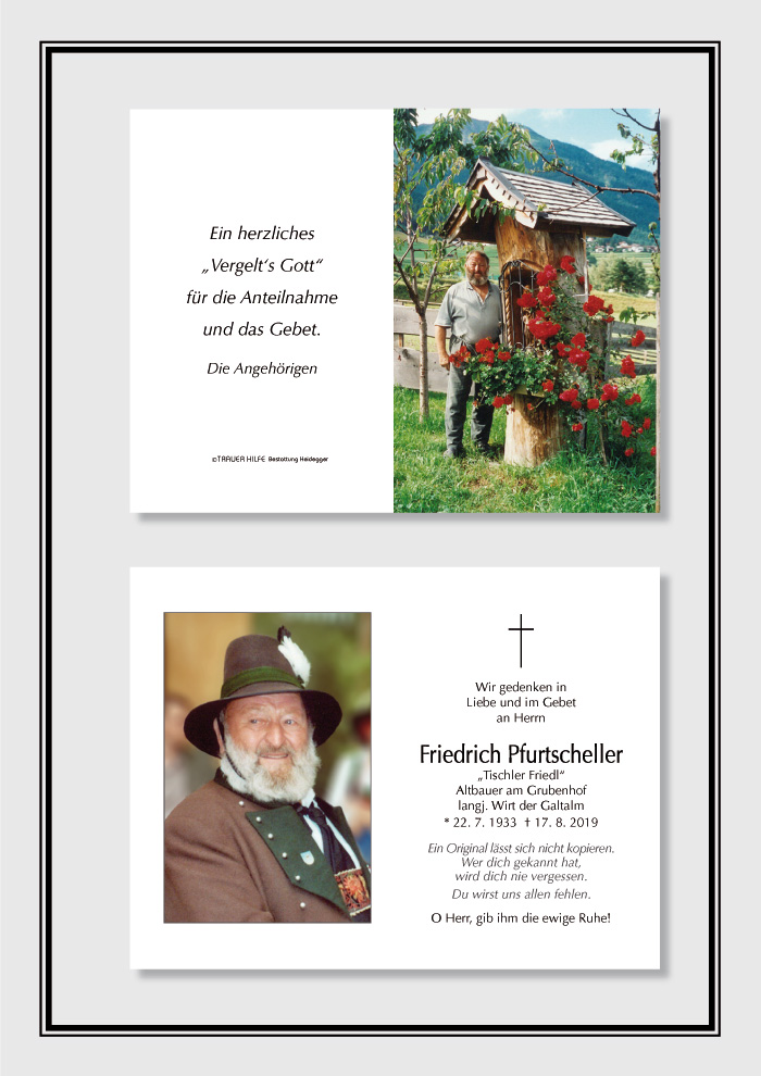 Bestattung wurde durchgeführt von: Karl Neurauter Karl Neurauter Bestattung Heidegger Brennerstraße 69 6150 - Steinach am Brenner Tel.: 05275 5211 zum Bestatter