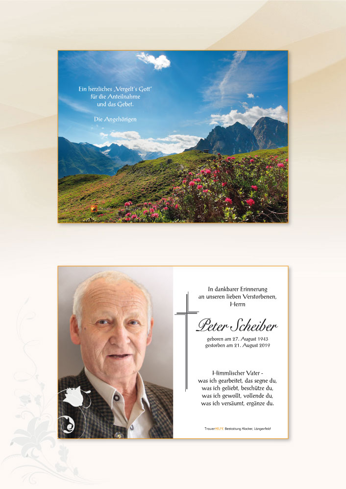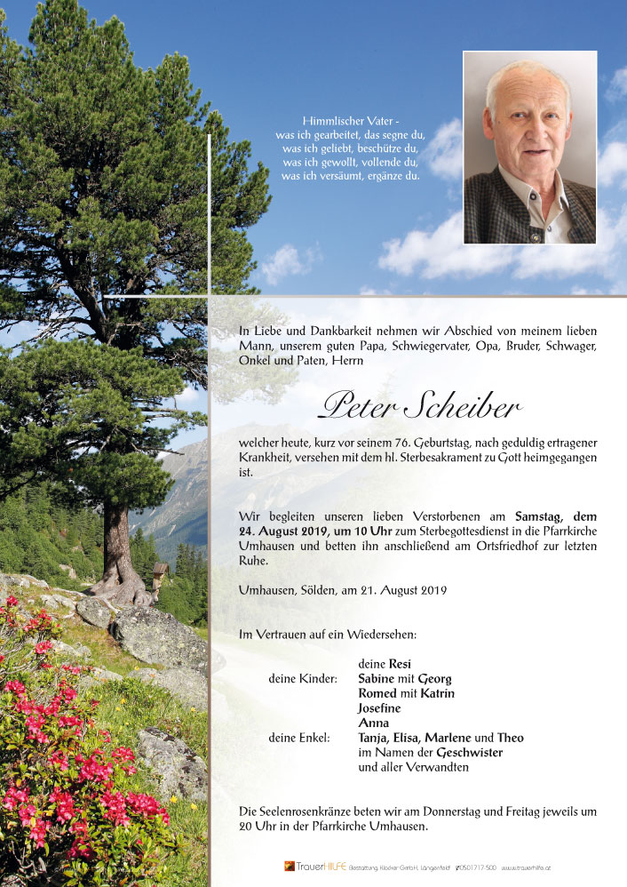 Aufrichtige Anteilnahme am Tode Eures lieben Peter, entbieten Familie Scharfetter, Gasthof Andreas Hofer Umhausen.