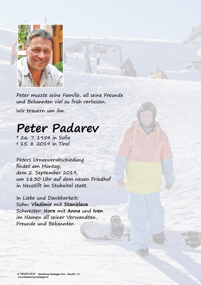 Bestattung wurde durchgeführt von: Karl Neurauter Karl Neurauter Bestattung Heidegger Brennerstraße 69 6150 - Steinach am Brenner Tel.: 05275 5211 zum Bestatter