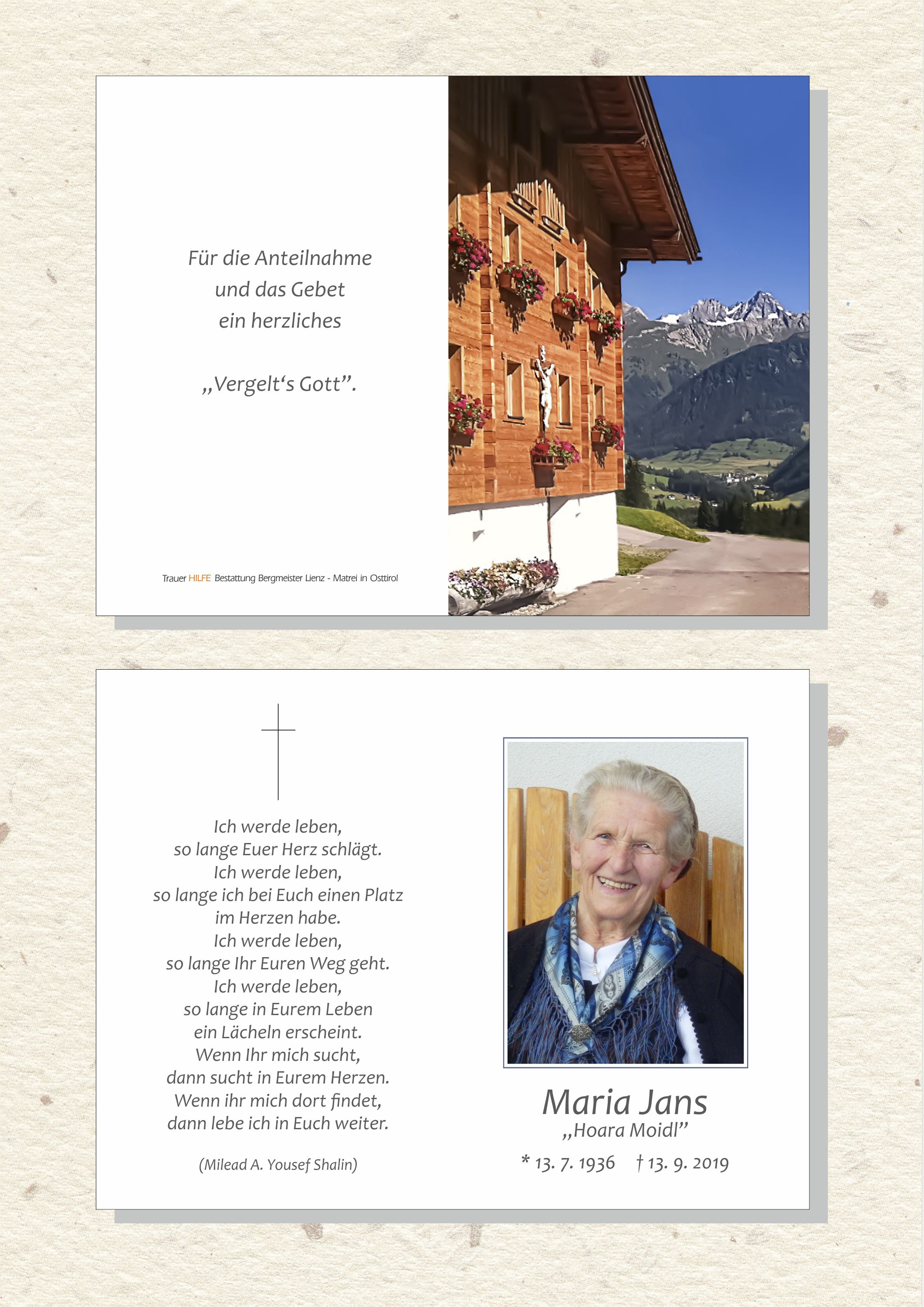 Liebe Moidl, dieser Spruch passt so gut zu dir, dein sonniges Gemüt, deine positive Einstellung zum Leben, dein Lachen und deine herzliche Gastfreundschaft werden uns ewig in Erinnerung bleiben! Beim Hoara war man einfach immer willkommen schön früher als wir noch Kinder waren und auch jetzt noch wo wir zwar nicht mehr so oft bei dir waren, uns aber bei den Besuchen beim Hoara immer wie zu Hause gefühlt haben und mit dir immer eine feine und luschtige Hoagascht gehabt haben. Liebe Moidl, ein letztes mal sagen wir Pfieti und Vagelts Gott für alles!