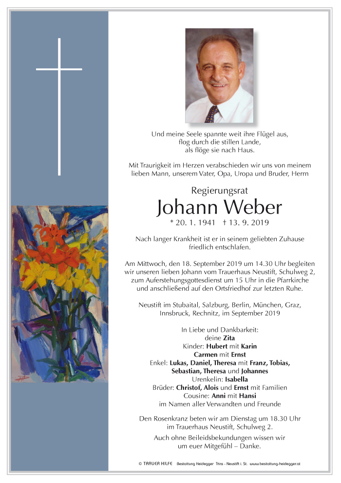 Bestattung wurde durchgeführt von: Karl Neurauter Karl Neurauter Bestattung Heidegger Brennerstraße 69 6150 - Steinach am Brenner Tel.: 05275 5211 zum Bestatter