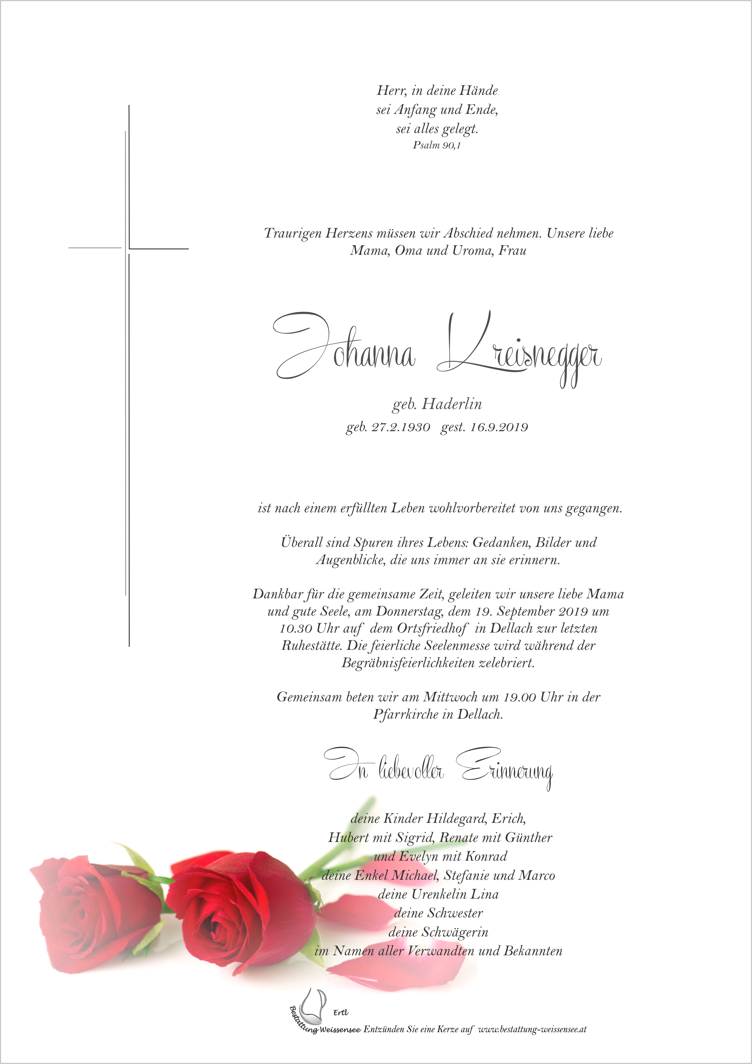 Neue Kerze für Johanna Kreisnegger entzünden.