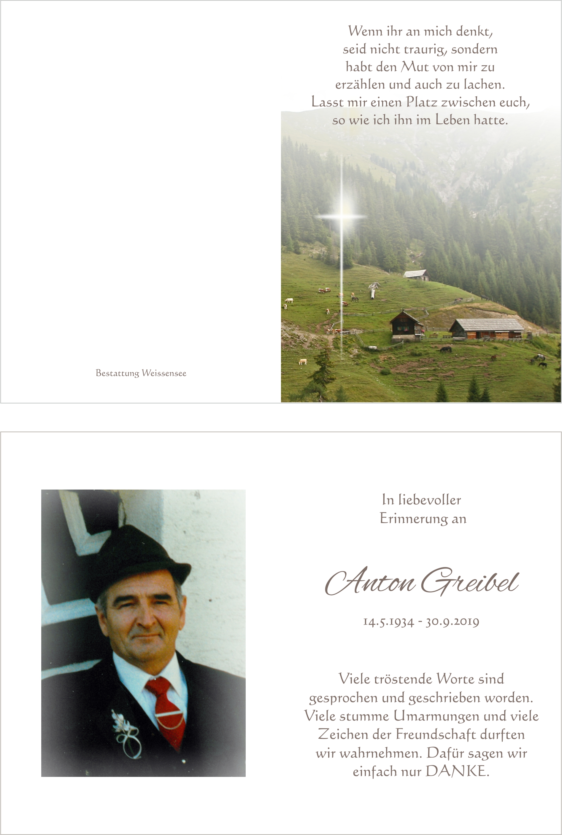 Bestattung wurde durchgeführt von: Markus Ertl Bestattung Weissensee Neusach 26 9762 - Weißensee Tel.: 04713 22 29 zum Bestatter