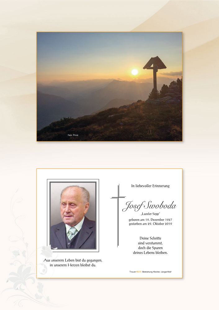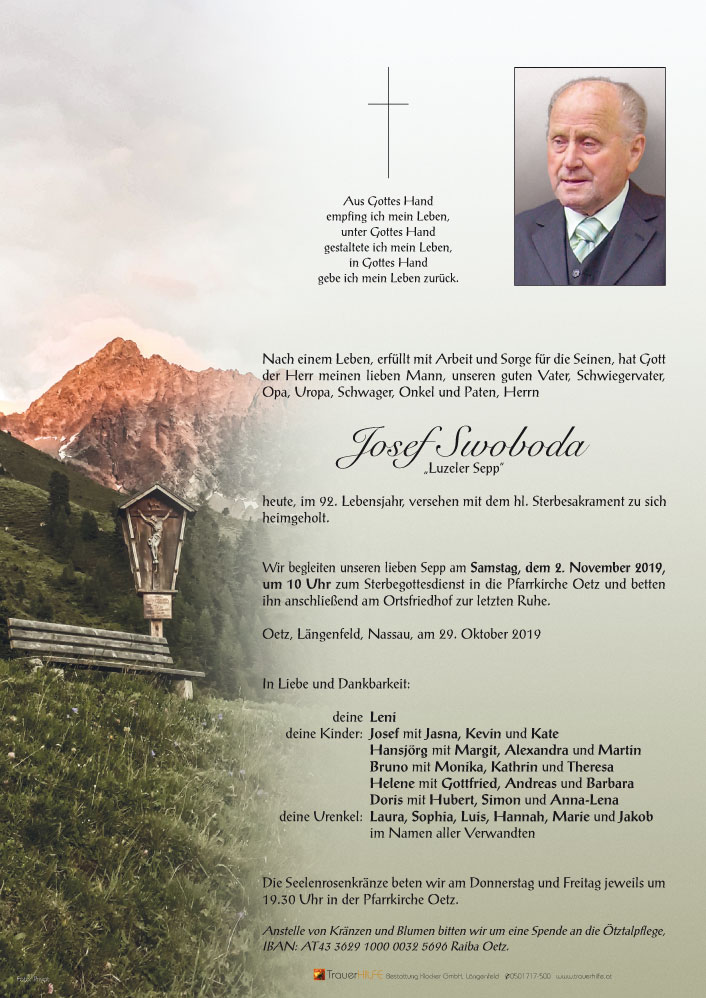 Einen Menschen loslassen, ist immer eine schwere Erfahrung. Wenn wir jemanden verlieren, der uns nahe stand und den wir geliebt haben, tut das besonders weh. Auch noch so gut gemeinte Worte können diesen Schmerz oft nicht lindern. Gedanken müssen geordnet und Gefühle bewältigt werden. Ihr dürft aber darauf vertrauen, dass Euer Sepp in eine wunderbare Begegnung mit Gott gekommen ist. Er läßt ihn nun ruhen in seinen liebenden Händen.