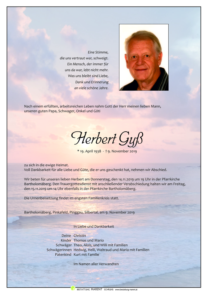 Bestattung wurde durchgeführt von: Peter Marent Bestattung Marent GmbH Gantschierstraße 80 6780 - Schruns Tel.: 05556 77070 zum Bestatter