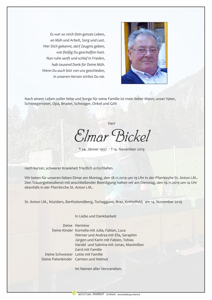 Bestattung wurde durchgeführt von: Peter Marent Bestattung Marent GmbH Gantschierstraße 80 6780 - Schruns Tel.: 05556 77070 zum Bestatter
