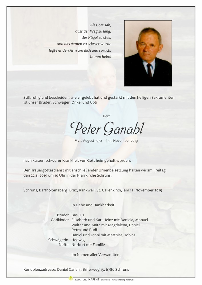 Bestattung wurde durchgeführt von: Peter Marent Bestattung Marent GmbH Gantschierstraße 80 6780 - Schruns Tel.: 05556 77070 zum Bestatter