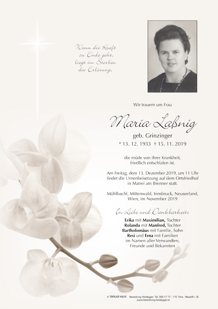 Bestattung wurde durchgeführt von: Karl Neurauter Karl Neurauter Bestattung Heidegger Brennerstraße 69 6150 - Steinach am Brenner Tel.: 05275 5211 zum Bestatter