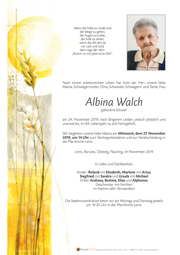 Tief betroffen habe ich vom Heimgang Eurer geliebten Mutter Albina erfahren.
