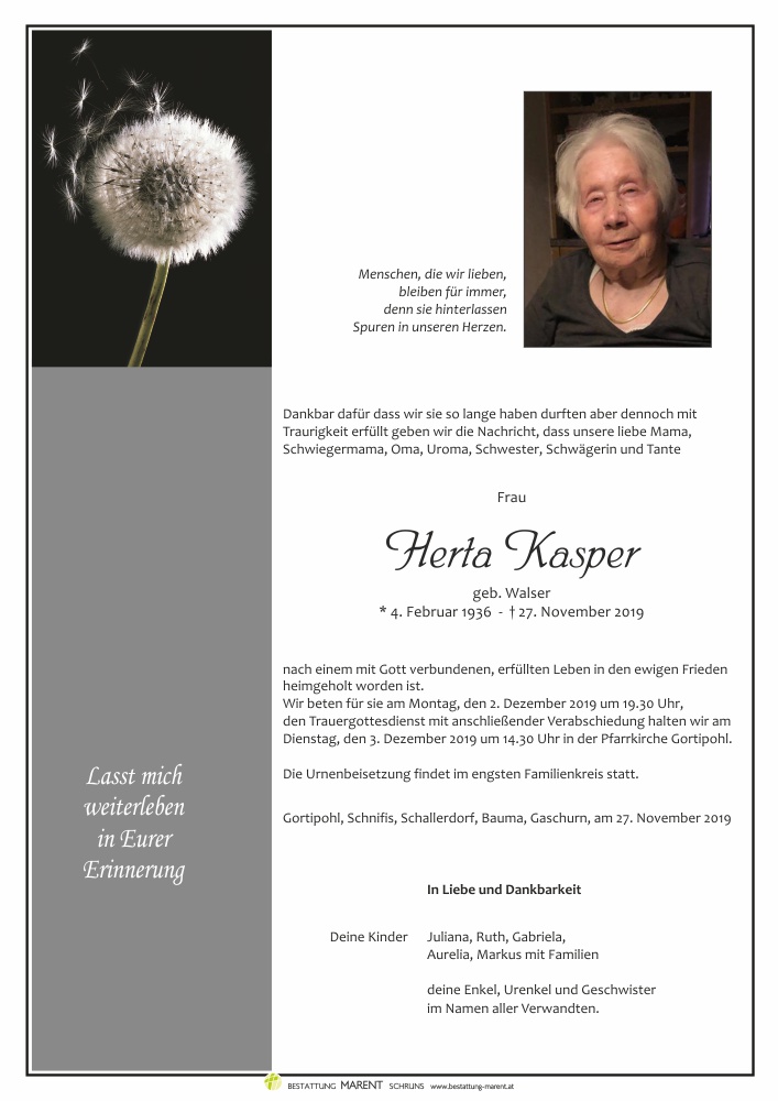 Bestattung wurde durchgeführt von: Peter Marent Bestattung Marent GmbH Gantschierstraße 80 6780 - Schruns Tel.: 05556 77070 zum Bestatter
