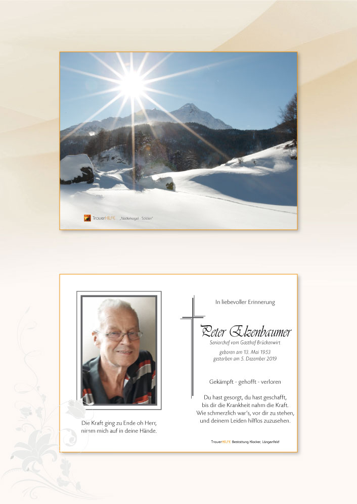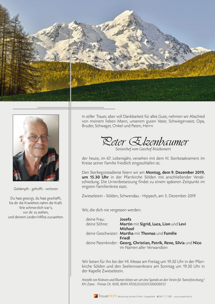 Lieber Herr Elzenbaumer, danke für all Ihre Gastfreundschaft in den zurückliegenden 28 Jahren. In unserer Erinnerung leben Sie weiter.08.12.2019 22:22 - Bernd und Jutta Arens