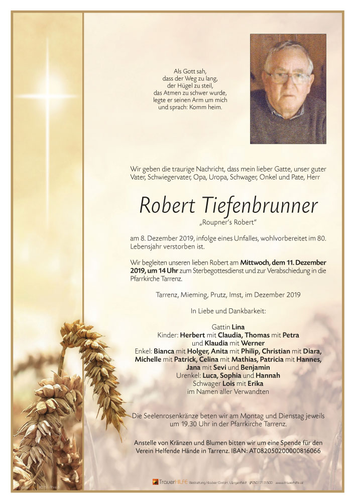 Nun hat euch Robert doch überraschend verlassen. Er wird in der ganzen Familie eine große Lücke hinterlassen. Bei jeder Begegnung war er zu Späßen aufgelegt und hat meist gute Laune verbreitet. Wir wünschen ihm nun eine gute Reise und euch, die nötige Kraft und Beistand, um den Verlust zu überwinden. Er wird immer in eurer Mitte bleiben.